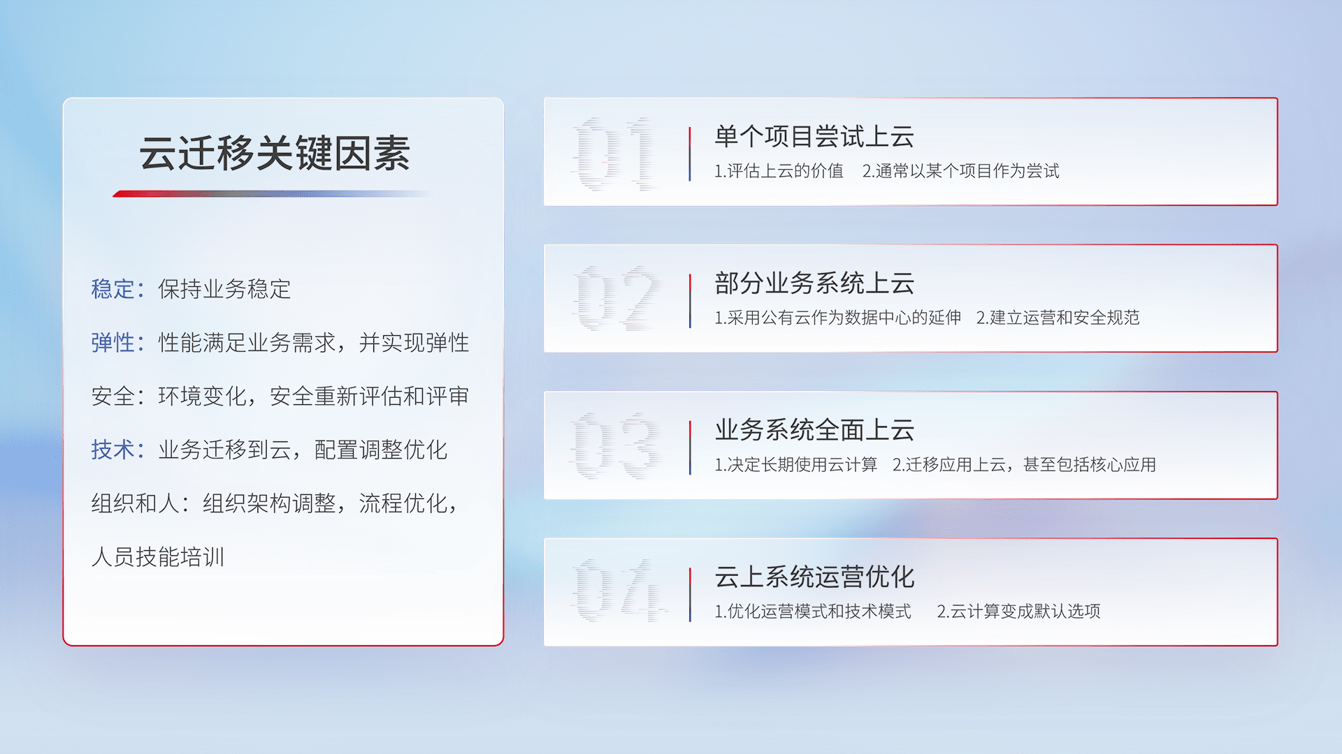 结合实际业务,,,,从规划设计、、云平台选型、、、、云原生改造、、、、数据迁移、、集成交付,,,,迁移全过程为客户识别最佳上云路径,,,做好风险识别管理,,,,设计网络架构、、、、身份权限、、、安全审计合规、、操作审计、、、、日志审计、、、、监控告警策略、、多站点容灾设计等,,,,对云上基础设施进行整体规划,,,,提升IT治理水平,,,,以满足弹性、、、、高可用、、、、高性能的需求。。