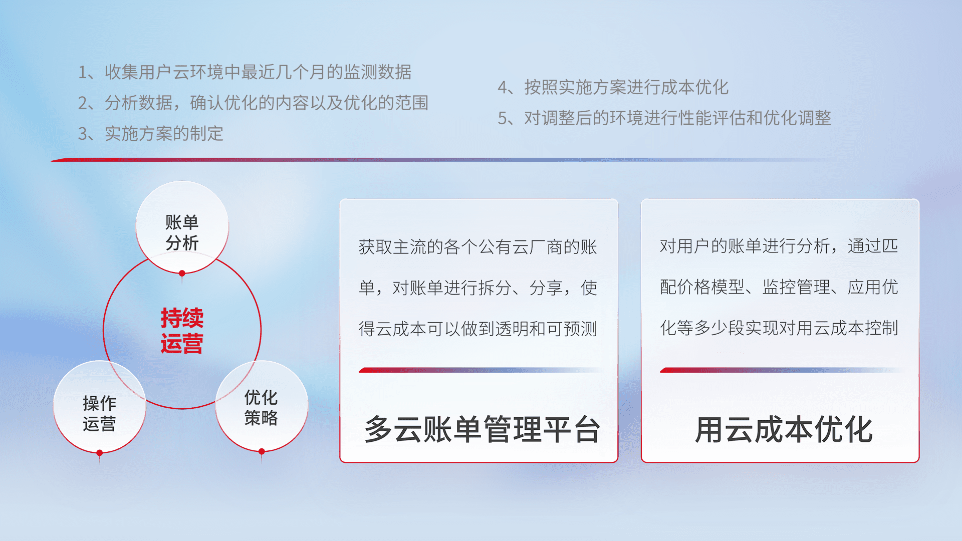 通过多云纳管,,,以统一的资源数据模型把客户的云资源进行抽象和封装,,,进而实现对多云资源的统一操作,,,,保障云资源管理的可靠性、、、稳定性与可用性。。量身定制化运维内容,,,,配置、、开发运维、、补丁管理、、、、备份、、、、监控、、、认证和访问管理、、、、审计和日常巡检等,,,保障在用云过程中的可靠度,,,,稳定度以及高可用率。。。。